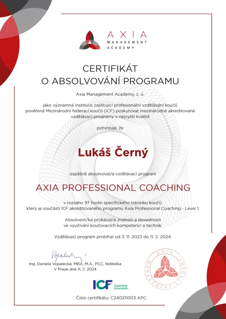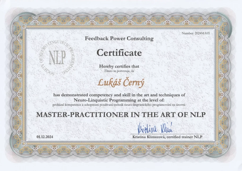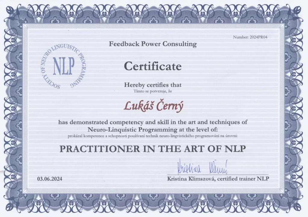 Certifikovaný profesionál: Mám formální vzdělání v oblasti NLP (Practitioner & Master) v NLP škola Harmonizace a profesionálního koučinku (Axia Management Academy).